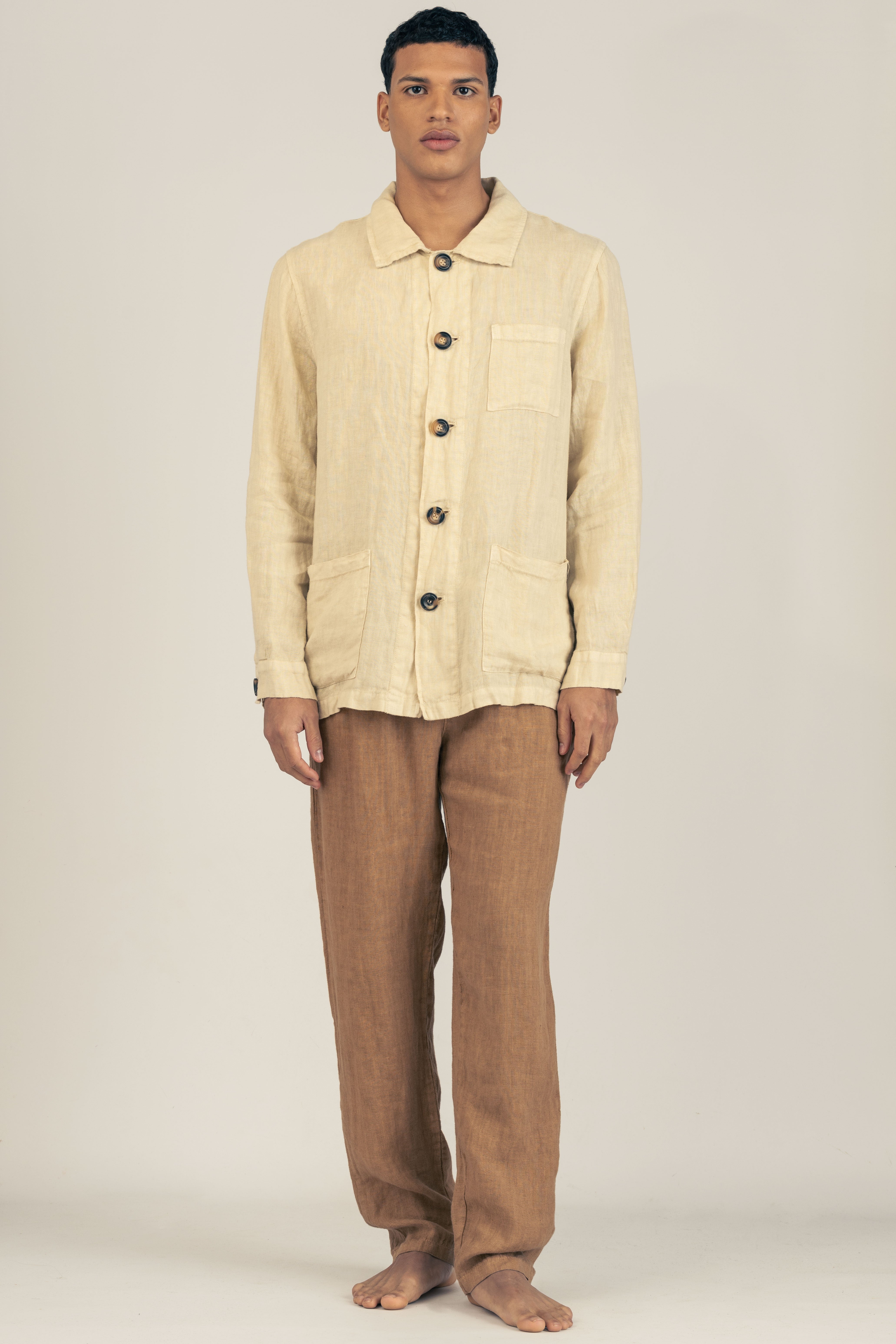 El lino es una de las fibras más antiguas conocidas por el ser humano — hilado y tejido durante más de 10.000 años. Más resistente que el algodón, naturalmente transpirable y diseñado para mejorar con el uso, no para desgastarse. Con el tiempo, se suaviza y evoluciona, adoptando la forma y la historia de quien lo usa.