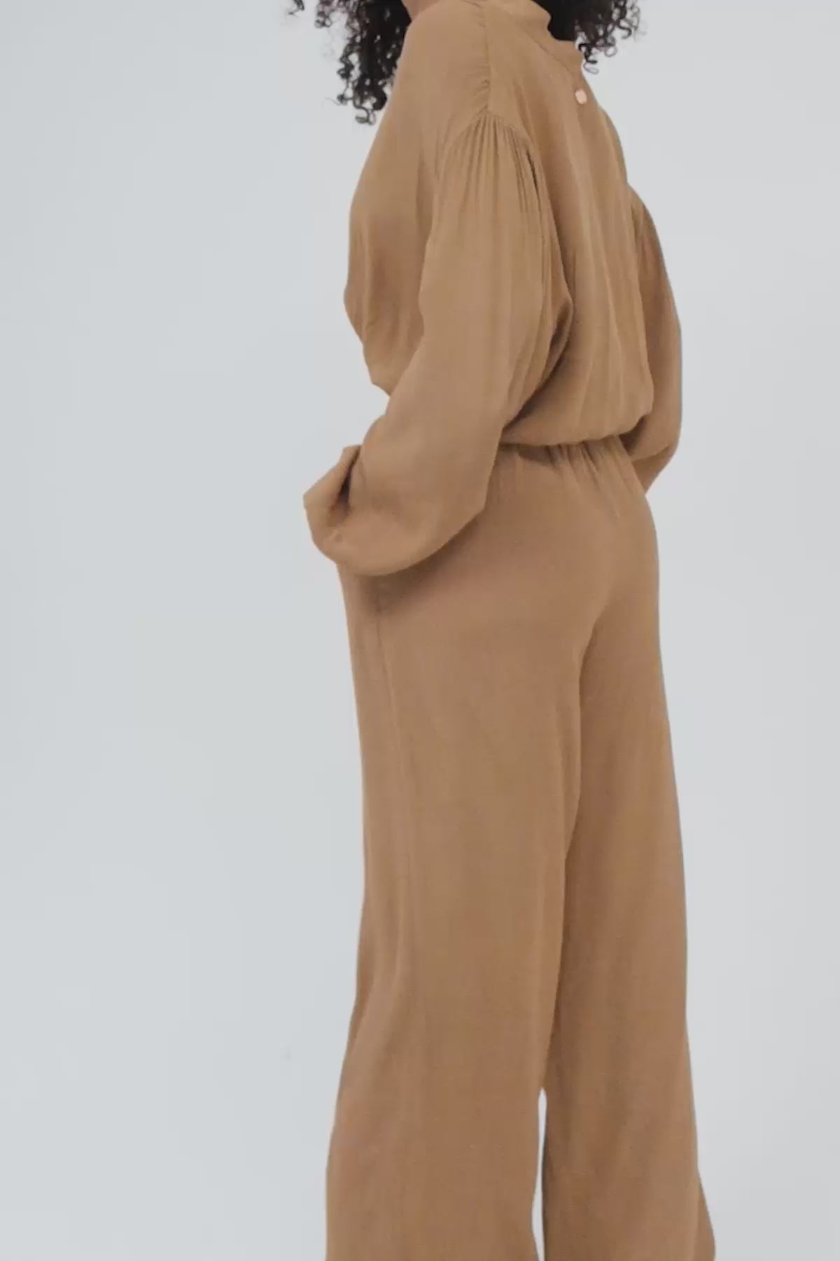 Pantalón recto confeccionado en crepé color bronce para un look fluido y relajado. La cintura elastizada proporciona un ajuste cómodo y favorecedor, mientras que los bolsillos laterales añaden funcionalidad. Los detalles en cobre con el logo de Polonio aportan un toque distintivo a la prenda.